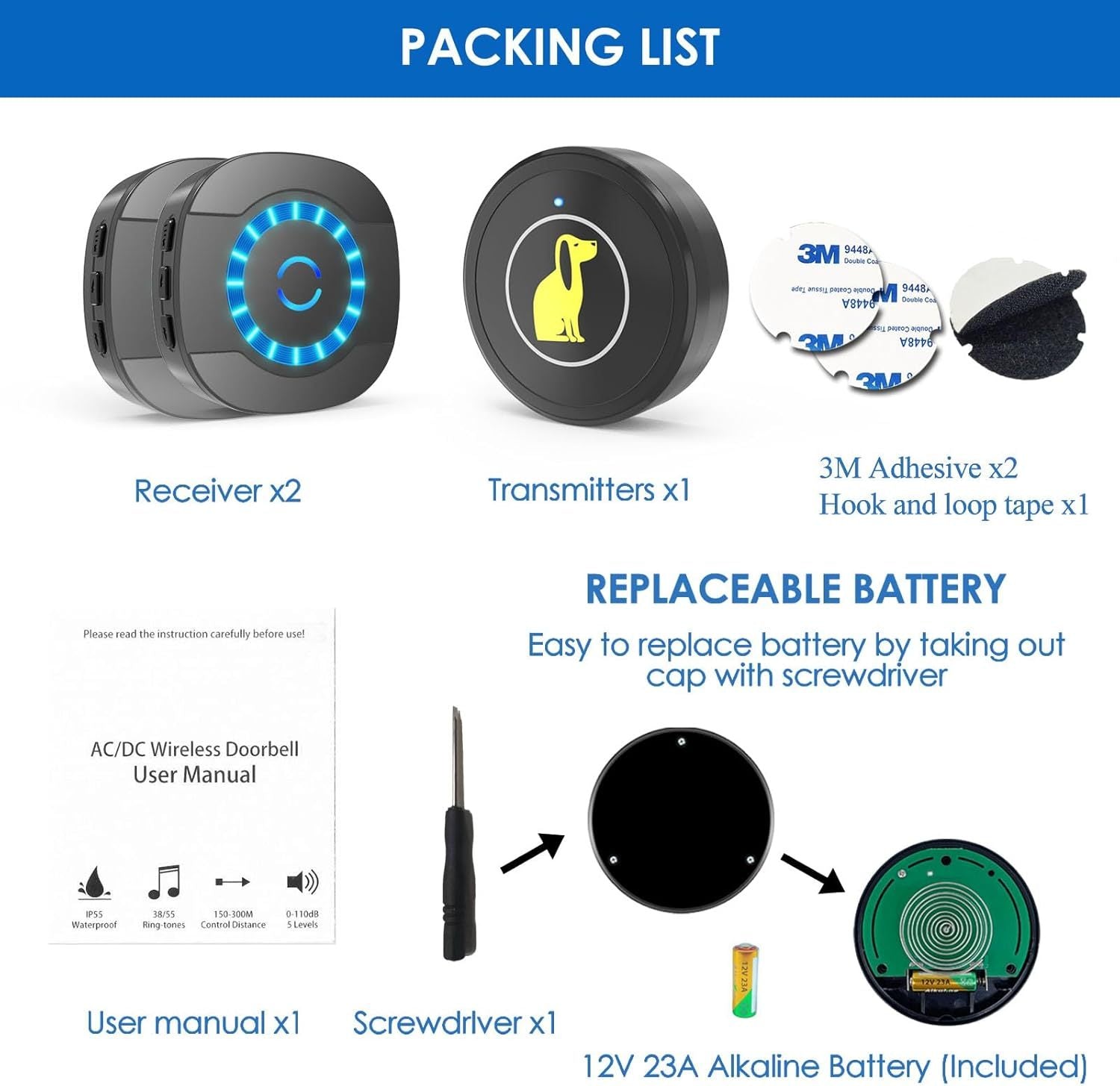 - Resistente al agua y al polvo: El timbre de entrenamiento para perros cuenta con certificación IP55 de resistencia al agua y al polvo, por lo que es ideal para usar en jardines, interiores y exteriores. Con una batería de litio de 23 A y un anillo de goma impermeable integrado, funciona con normalidad incluso en días lluviosos. Ofrece una señal potente y estable que se comunica a través de paredes hasta una distancia de 300 metros.